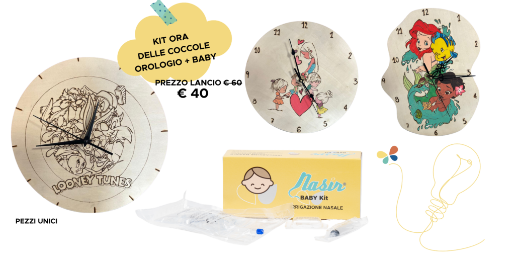 Il Kit Ora delle Coccole è un regalo unico che unisce un orologio artigianale in legno dipinto a mano (pezzi unici!) con i prodotti Nasir per l’igiene nasale del tuo bambino. Disponibile nella versione con Nasir Baby Kit o con Nasir Doccia Nasale.