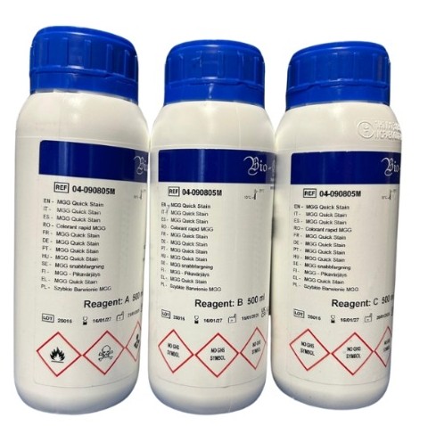 Kit di 3 reagenti 500ml per metodo MGG (May-Grümwald Giemsa) rapido. Include: Soluzione May-Grümwald (090805M), Soluzione Giemsa (460586), e terzo reagente.